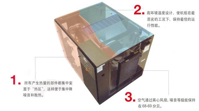 安装在高效电机上离心式冷却风扇,确保了机组噪音